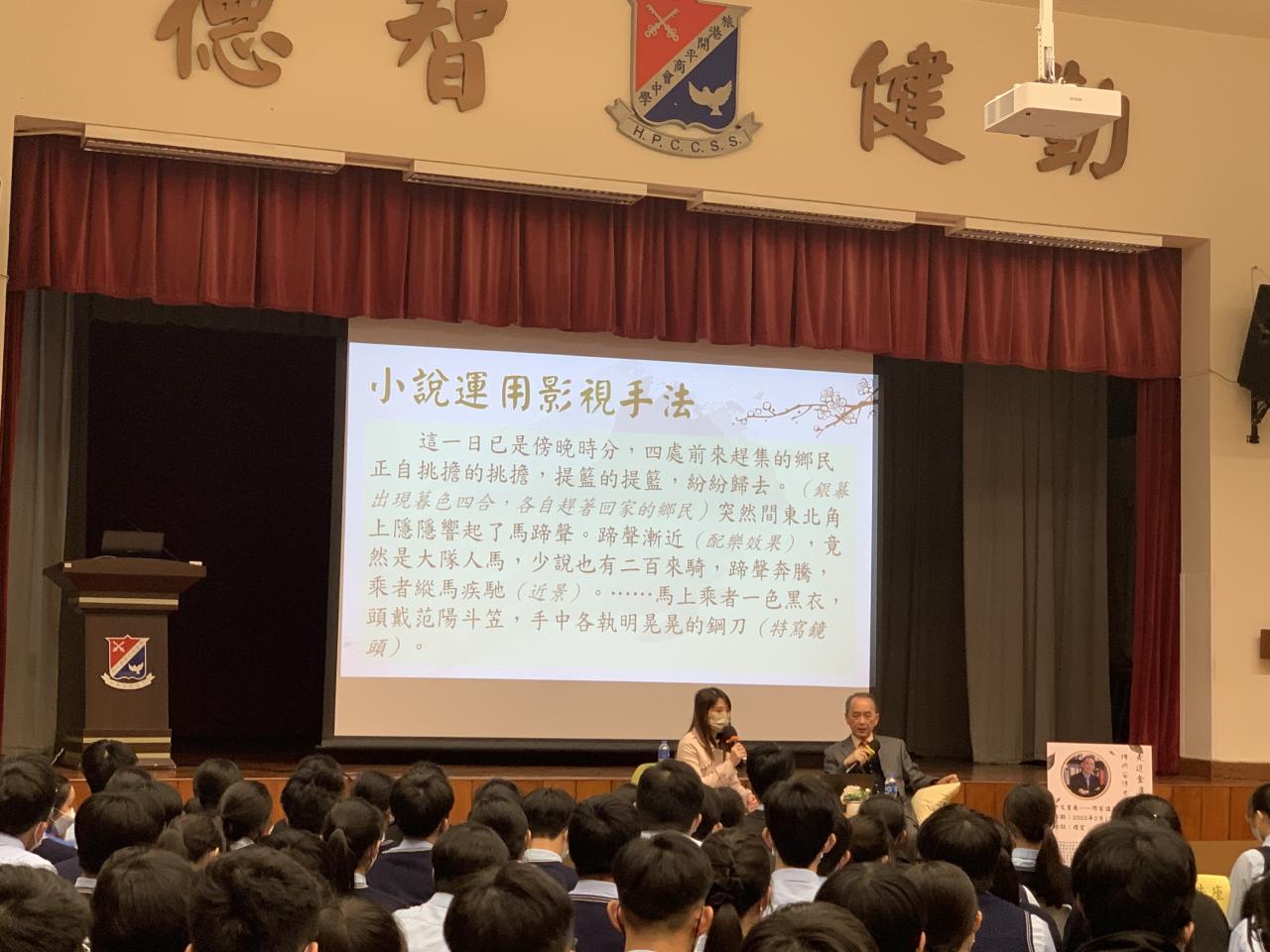 為推動校園閱讀風氣,本校於13/2-15/2期間舉行了為期三天中文書展。本年度書展的主題為「武俠文學」,主要介紹香港著名的武俠小說作家及其作品。書展期間,老師及中文學會成員於早會及中文課堂等積極向同學推介武俠小說及其他不同題材的書籍。此外,書展也設有由同學設計的版畫製作而成的藏書票和藏書印,為閱讀增添趣味。至於重頭戲書展講座,我們邀請了現任香港小說學會榮譽會長、曾任《明報月刊》高級編輯及《明報》社長室行政秘書、長江實業集團中文秘書的楊興安博士,帶領高中同學走進「金庸筆下世界」。初中方面,曾獲青年文學獎的作家袁兆昌先生則以武俠電影、電視劇及網絡遊戲等為例,引導同學在求真與求好之間檢視名家作品。楊博士學識淵博,文筆出眾,著作等身,從事文教工作多年,並對金庸著作有深入研究;袁先生亦對寫作及傳授饒有心得,同是金庸小說愛好者之一。他們生動有趣的分享實在令同學樂在其中,獲益不淺。