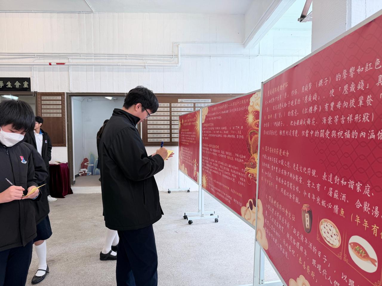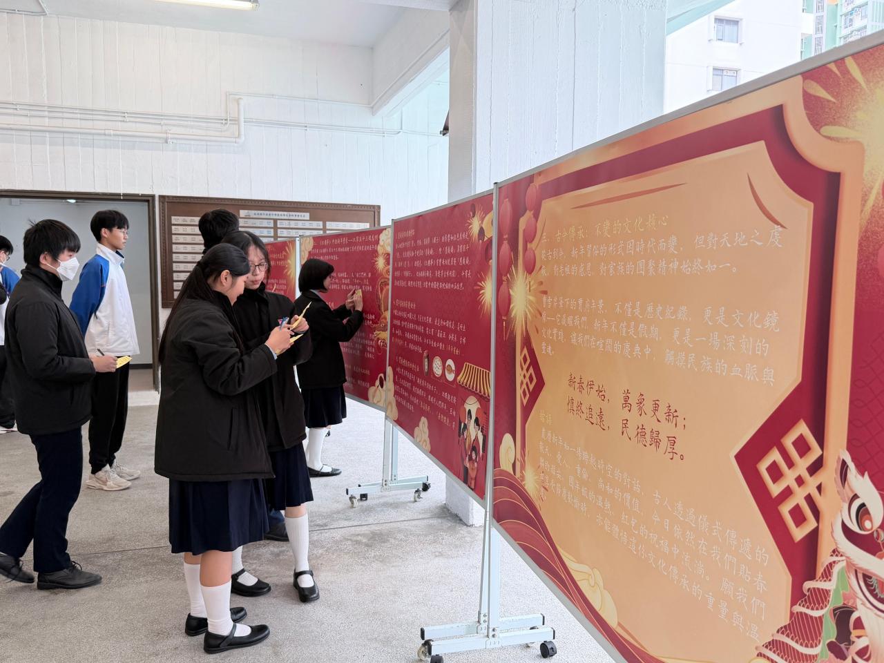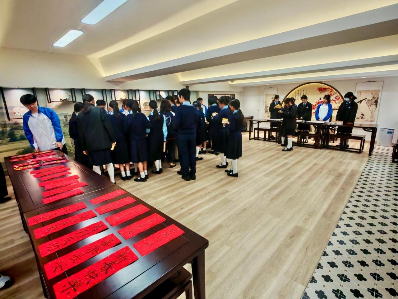 臨近農曆新年,中國文學科特意舉辦「農曆新年:傳承千年的文化盛宴」,以加深學生對中國傳統節日的習俗和意義的認識,傳承中國文化。當天午膳,學生在有蓋操場閱讀農曆新年介紹展板,又在中華文化室品嘗節日食品如意糕、觀賞書法表演、領取揮春、製作具驅邪納福之意的香囊,從中感受濃厚的節日氣氛,把滿滿的福氣帶回家。