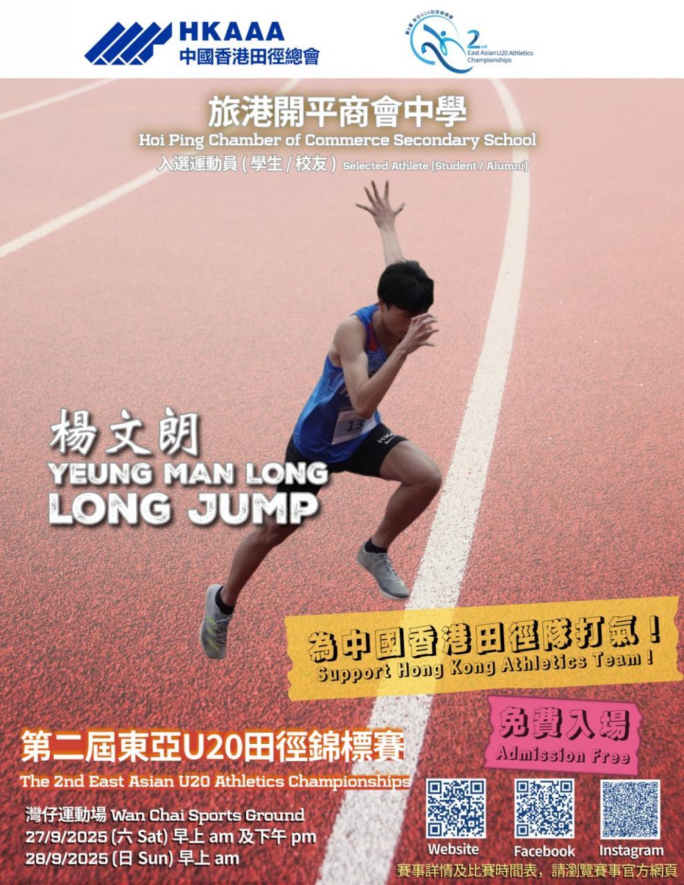 The Hong Kong, China Association of Athletics Affiliates has selected 79 young athletes to represent Hong Kong, China at the East Asian U20 Athletics Championships. Our student, Yeung Man Long (2024-2025 S6), will represent Hong Kong, China in the long jump event.