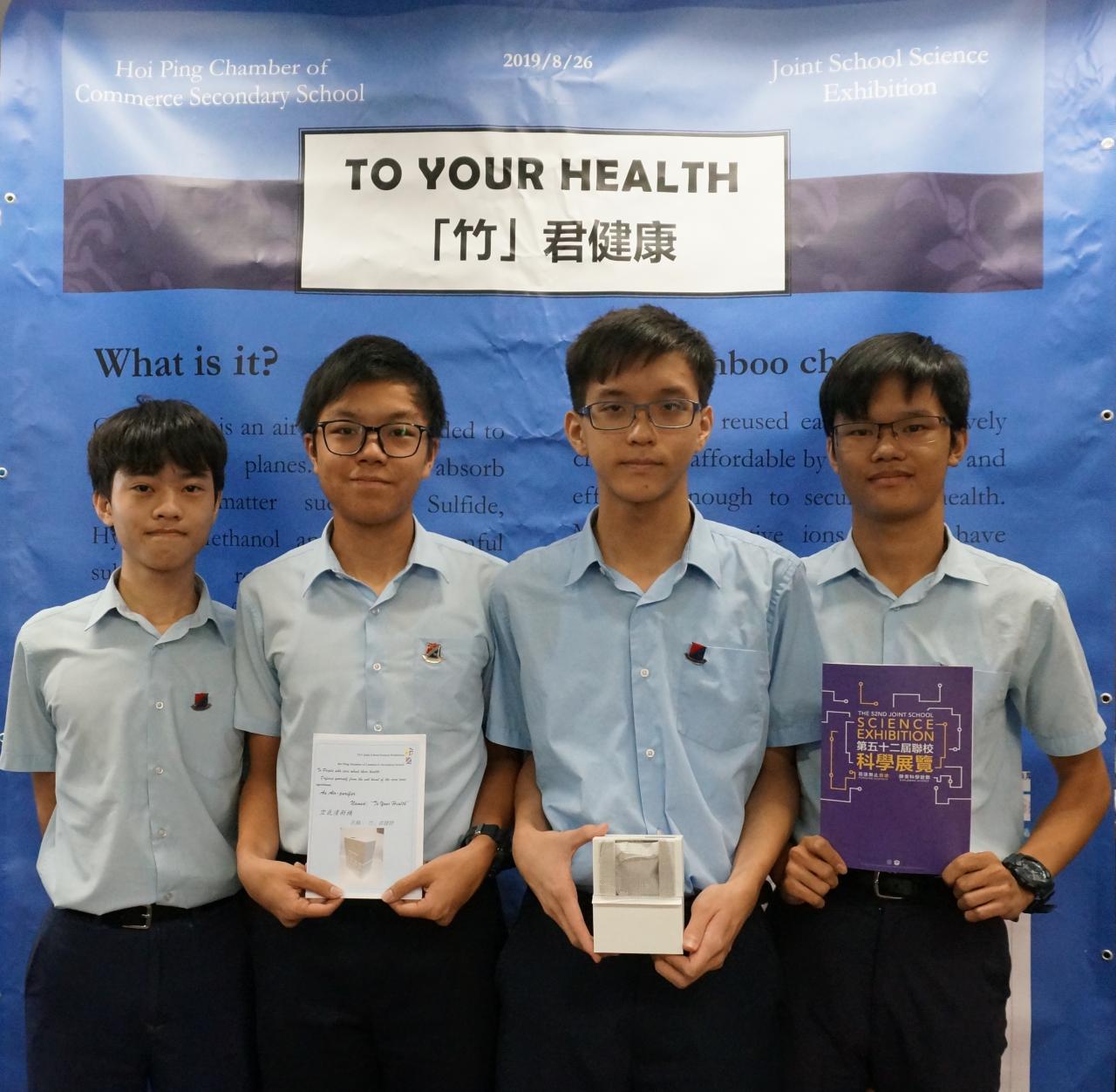 This summer, a team of S4 students, Li Ting Ping, Au Kwan Wo, Yue Ho Tin and Tai Chun Ho Ryan, participated in the 52nd Joint School Science Exhibition. The theme of this year’s competition was “Journey”. Our team designed and produced an air purifier with bamboo charcoal filters for travelers on board airplanes which we titled “To Your Health, 「竹」君健康”. We chose bamboo charcoal to filter the air instead of using ion purification as some airports do not accept ionizers on board. Besides, bamboo charcoal is cheap and reusable. Our air purifier was featured in an exhibition at the Central Library from 19th to 26th August 2019. Our team has gained insight from this invaluable experience.